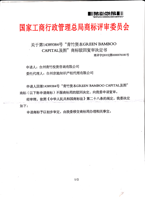 “青竹资本GREEN BAMBOO CAPITAL及图”商标驳回复审决定书